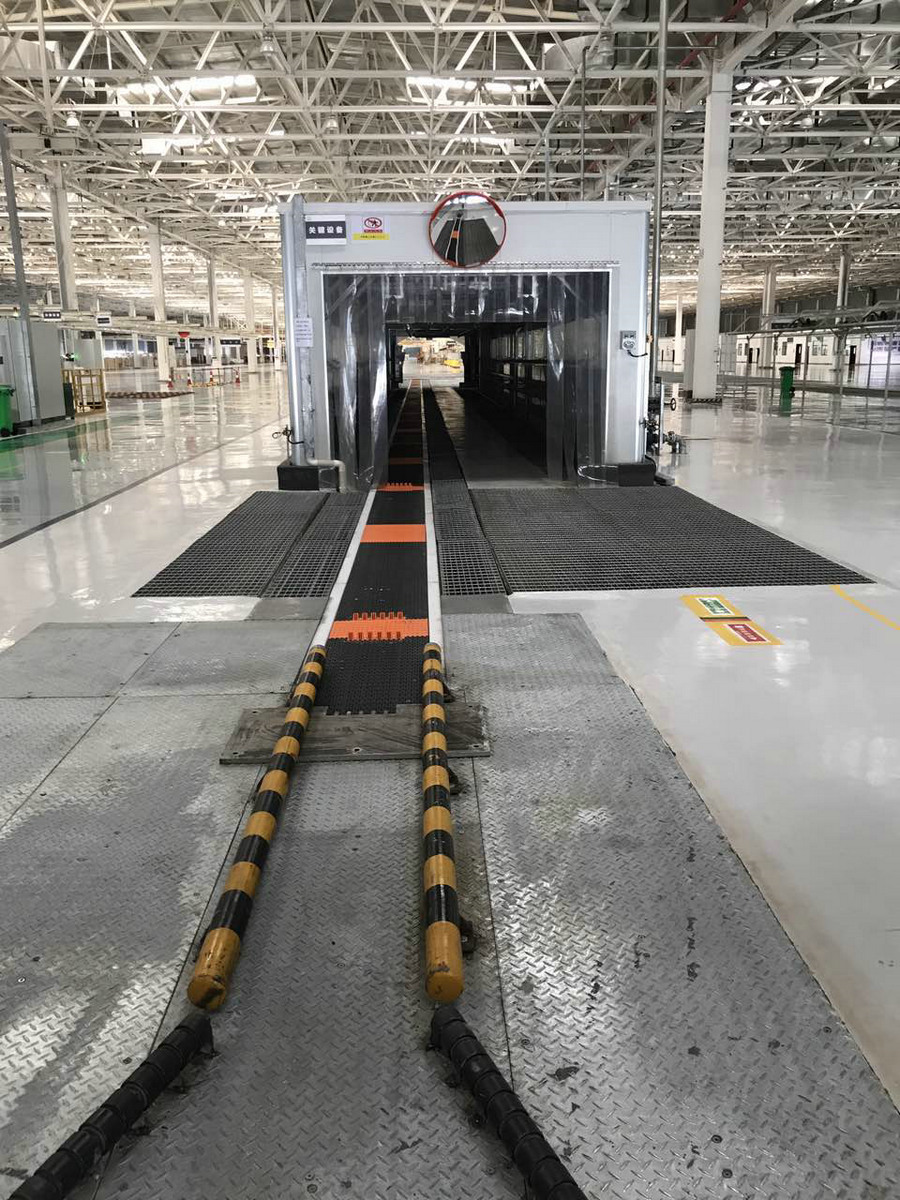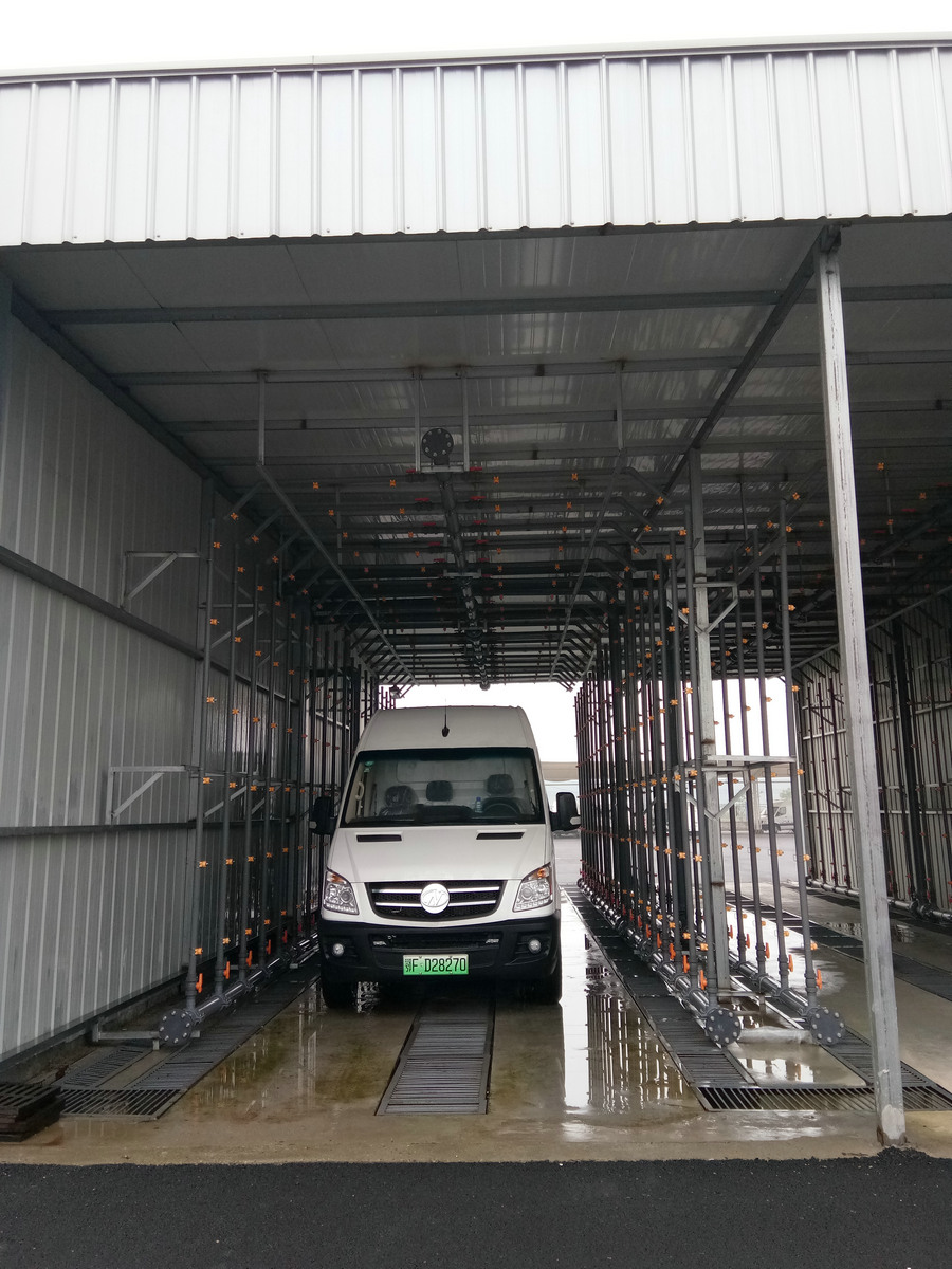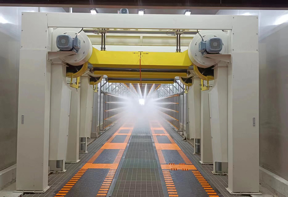 淋雨系統由室體、噴淋系統、鋼結構骨架、地坑蓋板、地坑照明及電氣控制系統等組成。淋雨強度可達中高等強度≧25L(min*㎡),淋雨時間≧15分鐘,水泵可采用變頻可調,淋雨方式(手)自動全噴淋。